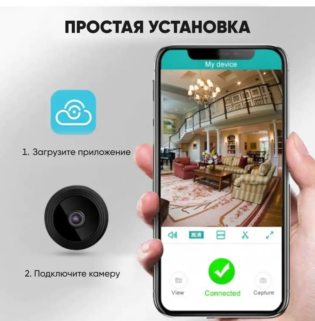 Для работы мини камеры вам необходимо скачать приложение, которое позволит камере транслировать изображение на ваш смартфон. Камера связывается с мобильным устройством Wi-Fi и передает сигнал на расстоянии от 10 метров.